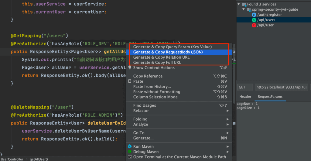 举个例子。我们选中 Controller 中的某个请求对应的方法右击,你会发现多了几个可选项。当你选择Generate & Copy Full URL的话,就可以把整个请求的路径直接复制下来。eg: http://localhost:9333/api/users?pageNum=1&pageSize=1 。