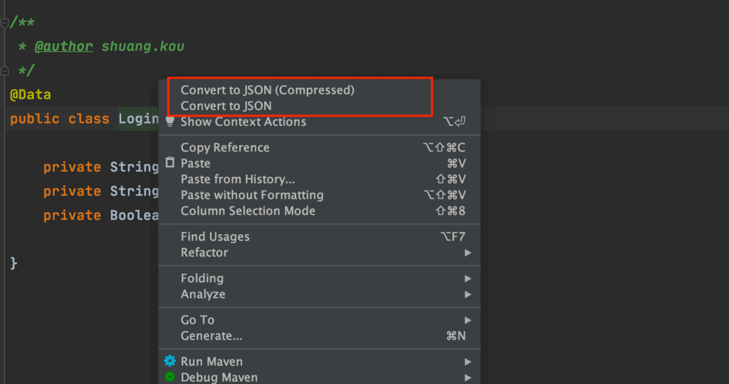 这个插件还为 Java 类上添加了 Convert to JSON 功能 。